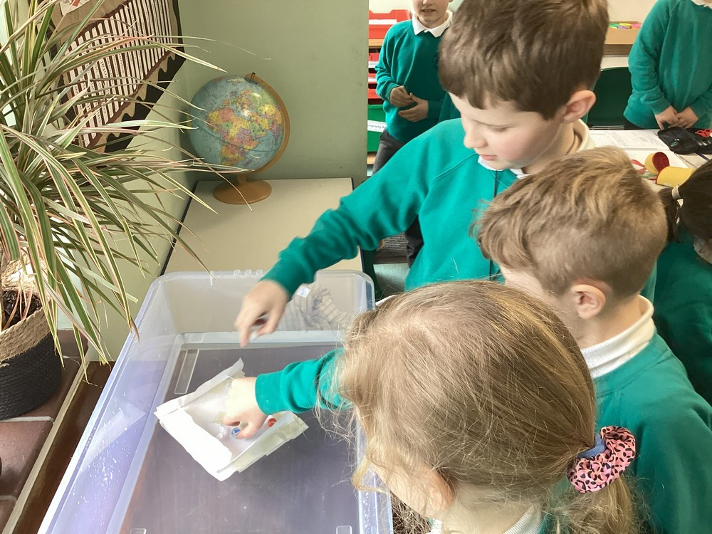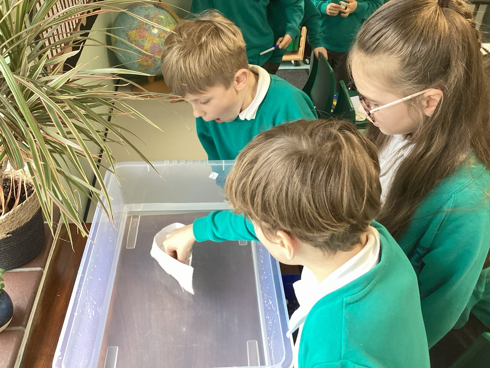 In small groups, we used paper and tape to create our own boats. The aim was to try and build a boat to carry the most amount of marbles, before it sinks. We tested our boats in a tray of water and slowly added marbles. We recorded the number of marbles held for each boat and compared the different boat designs.